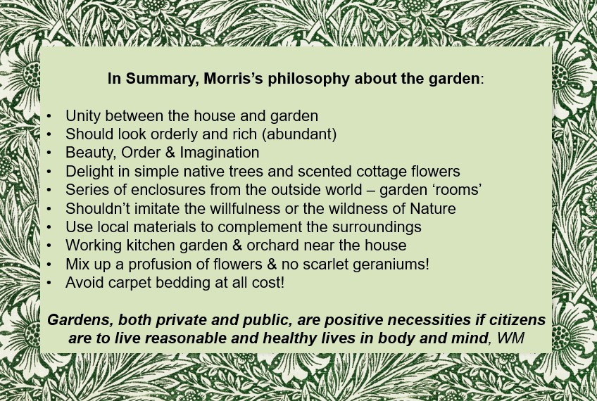 William Morris’s Philosophy about Gardens January 20, 2026The last slide of Fiona Rose’s “In the Garden with William Morris” showed his philosophy about Gardens